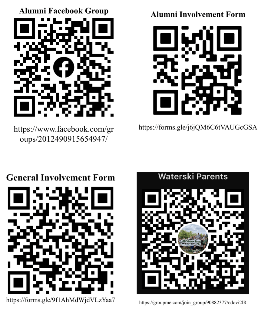The MSU Waterski Team cannot thank you enough for your ongoing support and encouragement. Please check out the team’s social media pages for pictures, tournament schedules, merchandise, and information on upcoming events. Also, below the letter are four QR codes: the alumni Facebook group, alumni involvement form, general involvement form, and GroupMe group chat for the parents of current skiers on the team. Once again thank you for your support this skison, we can’t wait to see you in 2023!